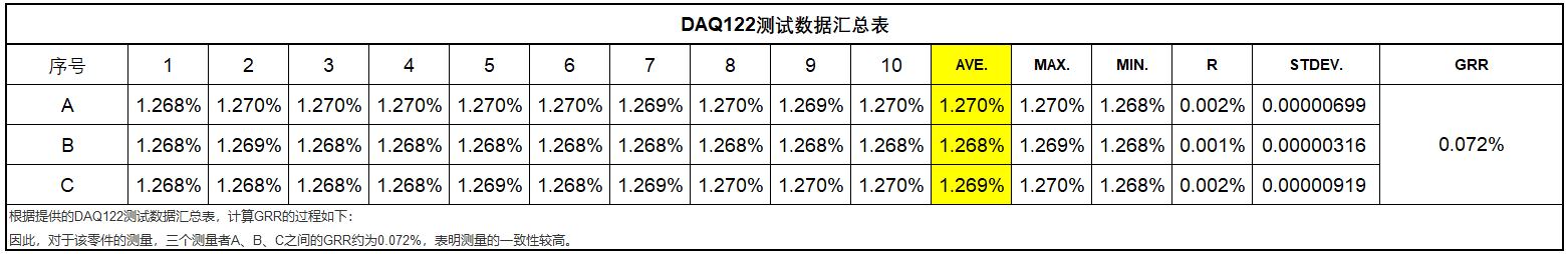 Om er zeker van te zijn dat de geselecteerde data-acquisitiekaart aan de eisen voldoet, heeft het ME-team deze getest. Uit de analyse blijkt dat de geselecteerde data-acquisitiekaart uitstekende stabiliteit heeft, met een GRR van ongeveer 0,072% voor drie meters A, B en C.